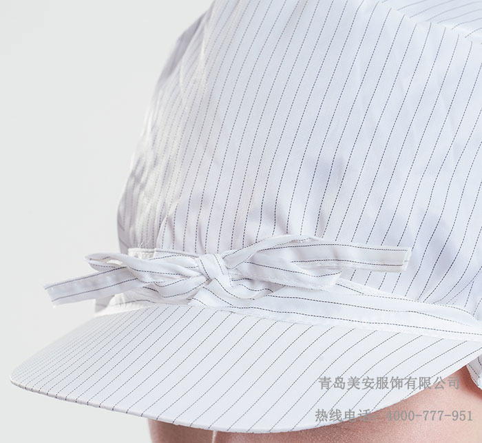 美安服饰防静电帽子是由专用的防静电洁净面料制作。此面料采用专用涤纶长丝,经向或纬向嵌织导电纤维。 具有高效、永久的防静电、防尘性能,薄滑,织纹清晰的特点。在制作成衣过程中采用专用的包缝机械,有效减少微粒的产生。无尘的粘扣带避免了因掉毛污染环境。根据级别要求提供不同款式,并采用导电纤维缝制,使防静电帽子各部分保持电气连续性,从而满足高级别无尘环境的要求。