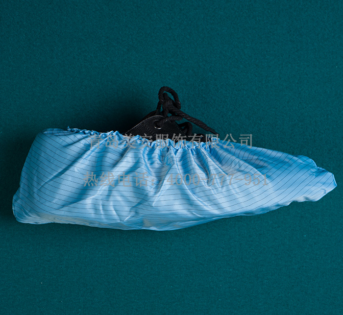 美安服饰防静电鞋套是由专用的防静电洁净面料制作。此面料采用专用涤纶长丝,经向或纬向嵌织导电纤维。 具有高效、永久的防静电、防尘性能,薄滑,织纹清晰的特点。在制作防静电鞋套过程中采用专用的包缝机械,有效减少微粒的产生。无尘的粘扣带避免了因掉毛污染环境。根据级别要求提供不同款式,并采用导电纤维缝制,使防静电鞋套各部分保持电气连续性,从而满足高级别无尘环境的要求。