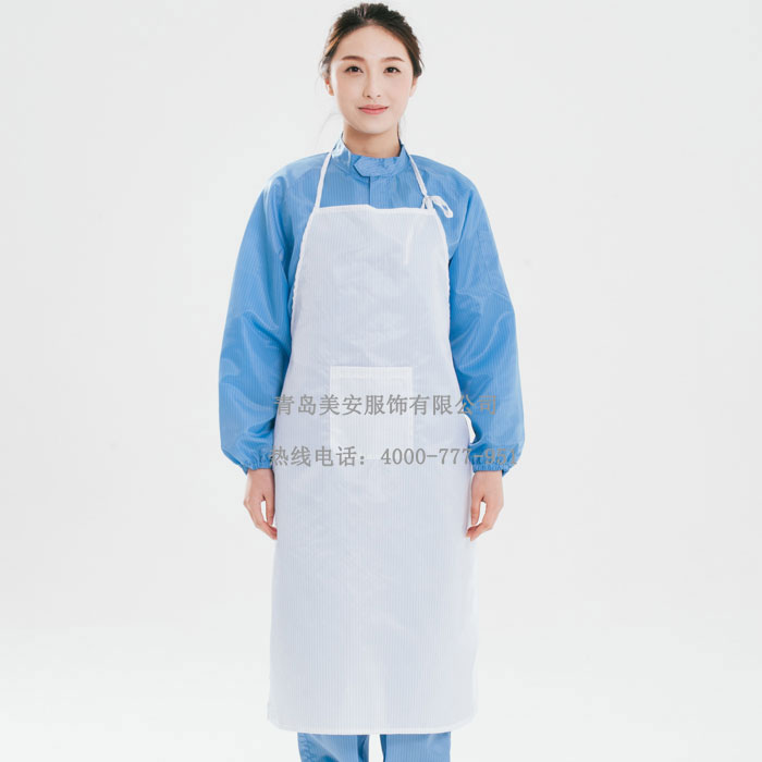 美安服饰防静电围裙是由专用的防静电洁净面料制作。此面料采用专用涤纶长丝,经向或纬向嵌织导电纤维。 具有高效、持久的防静电、防尘性能,薄滑,织纹清晰的特点。在制作防静电围裙过程中采用专用的包缝机械,有效减少微粒的产生。无尘的粘扣带避免了因掉毛污染环境。根据级别要求提供不同款式,并采用导电纤维缝制,使防静电围裙各部分保持电气连续性,从而满足高级别无尘环境的要求。